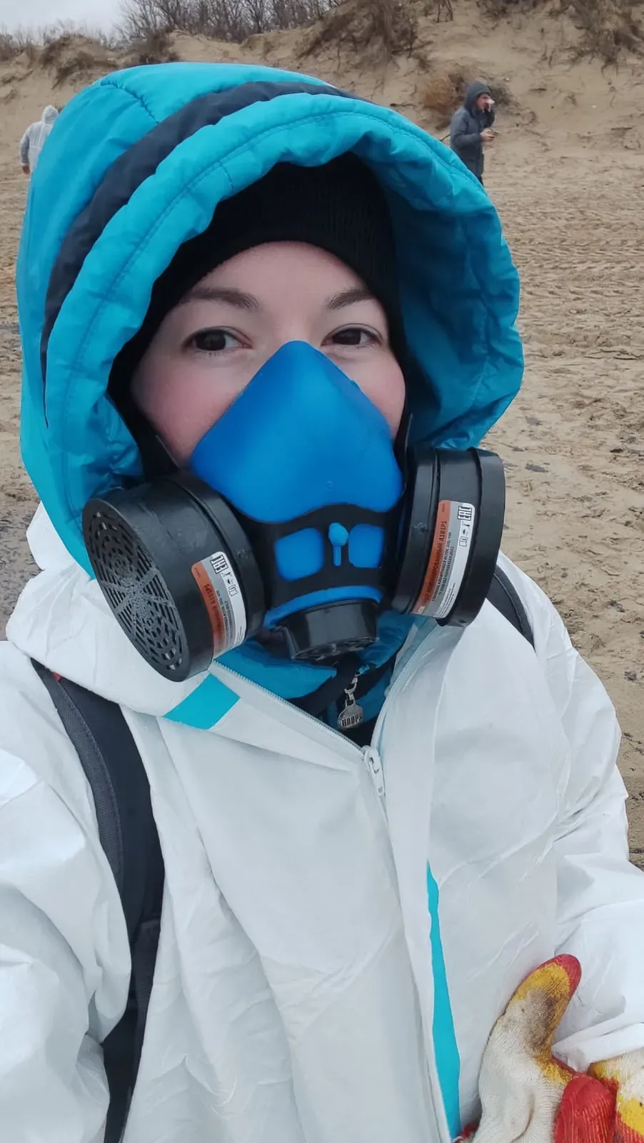 Необходимо работать в специальном костюме и респираторе, иначе невозможно. Морально все это не просто, так как у берега много птиц, которые в мазуте. Их очень жалко.