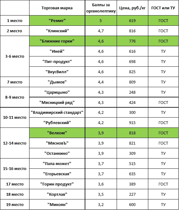 Лидером вкусового рейтинга стал сервелат "Ремит", получивший высшую оценку 5 баллов и одновременно являющийся товаром повышенного качества. Десять образцов заняли позицию "хорошистов" с баллами от 4,2 до 4,7, а восемь продуктов получили оценки от 3,2 до 3,9 баллов.