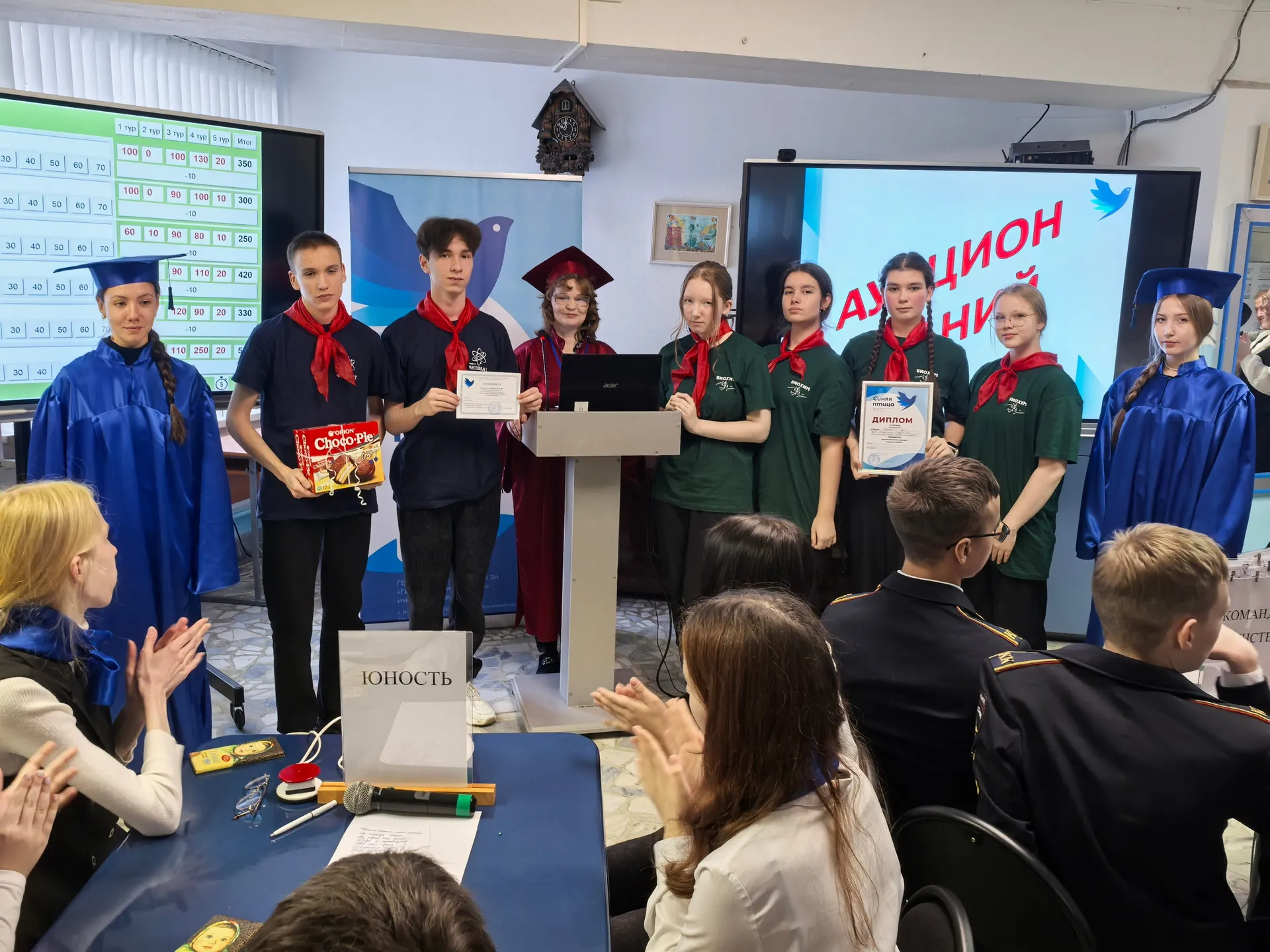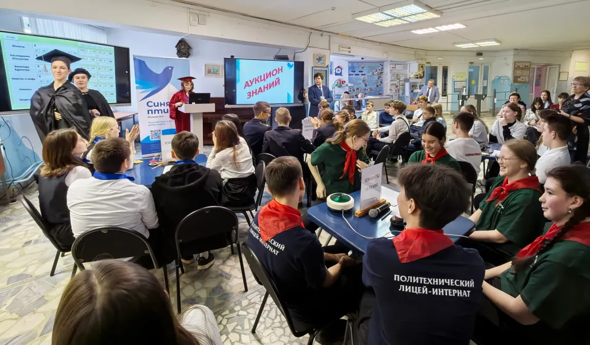 В Гуманитарной гимназии «Синяя птица» имени Т. В. Иштриковой прошёл республиканский конкурс «Аукцион знаний». За победу сражались шесть команд учащихся 7–9 классов из образовательных учреждений республики.