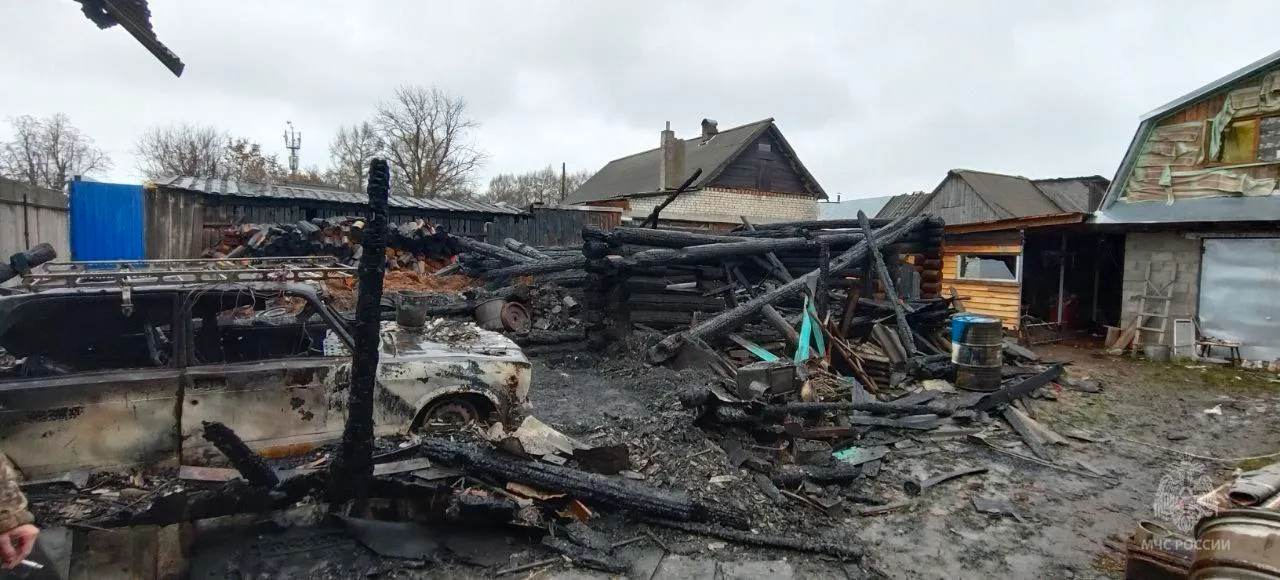 В результате происшествия уничтожены гараж с автомобилем, хлев и сарай. Специалисты государственного пожарного надзора устанавливают причину возгорания.