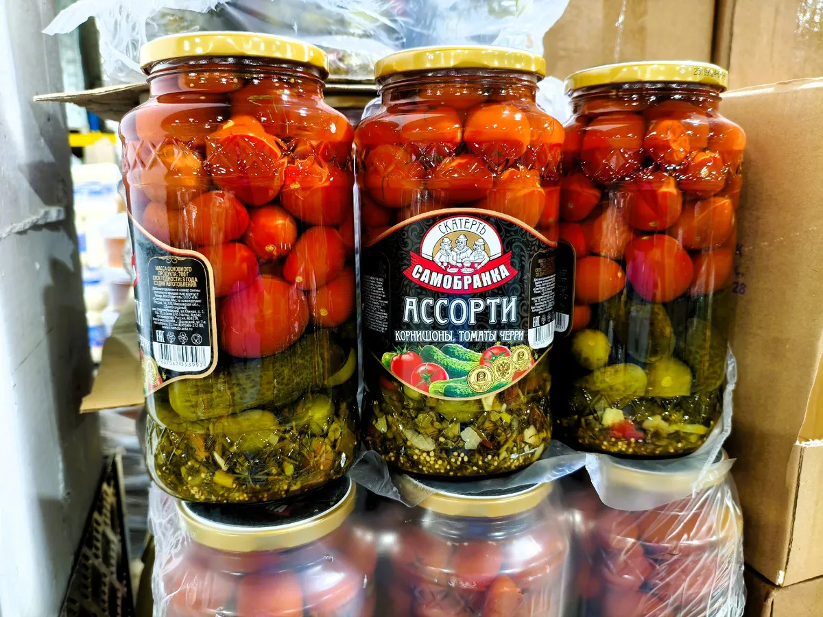 В магазине представлен широкий ассортимент товаров. Среди новинок выделяется маринованное ассорти из томатов черри и корнишонов в большой банке. Продукт имеет натуральный состав с добавлением горчичных семян.