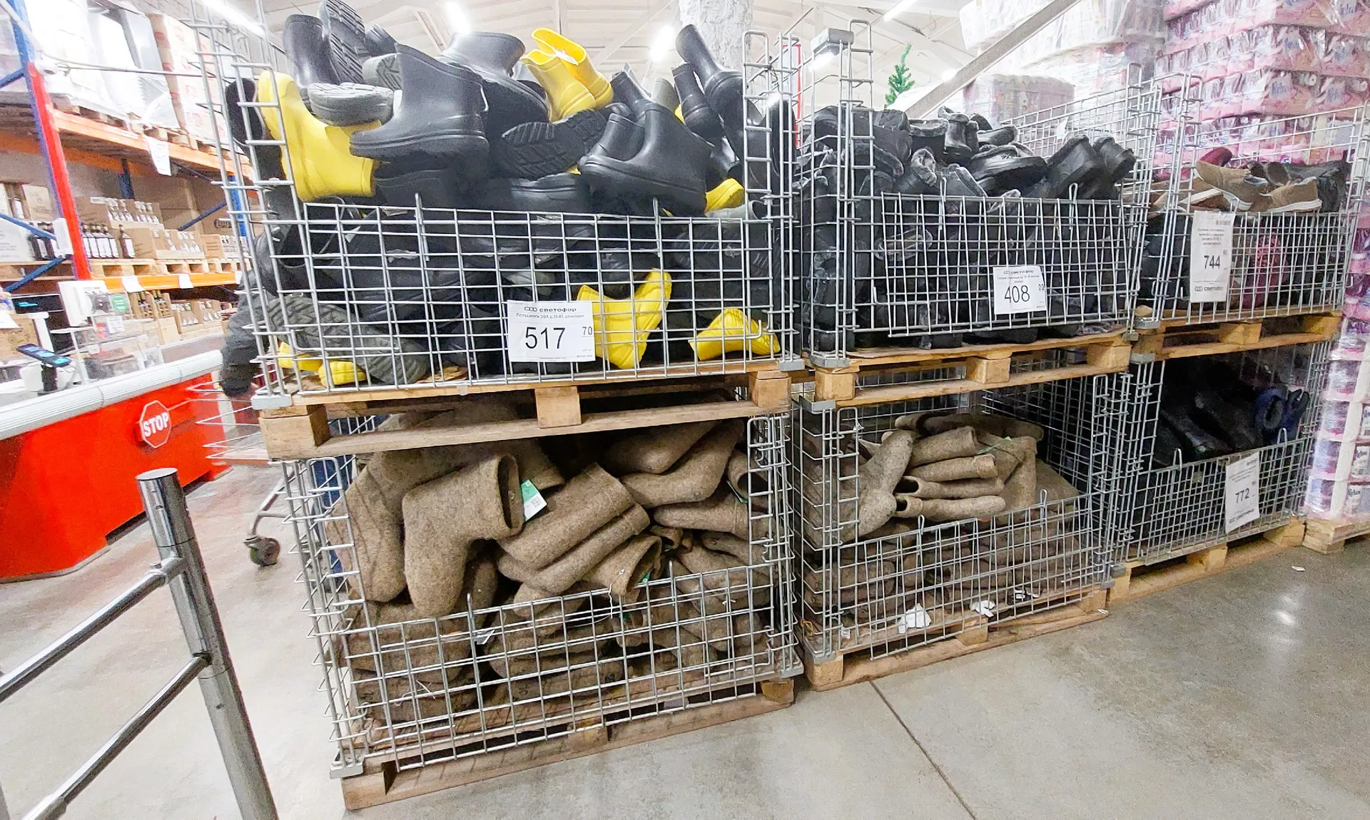 Накануне вечером был совершён визит в магазин "Светофор" для ознакомления с новыми поступлениями. Среди новинок были обнаружены валенки — традиционная зимняя обувь, изготовленная в Туркменистане из натуральной шерсти методом валяния. Они представлены в размерах 24-31 и отличаются загибом на верхнем крае. Стоимость пары составляет 1222 рубля. Помимо валенок, в ассортименте присутствуют утеплённые ботинки, галоши с меховой опушкой и полусапожки.