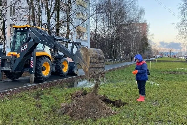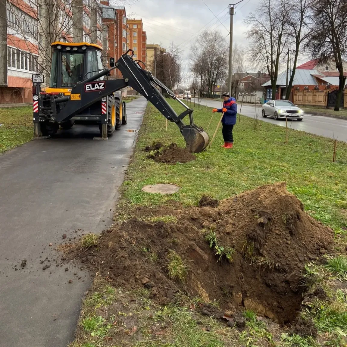 Часть сотрудников готовит территорию. Наносит «разметку» под будущие зелёные акценты. Другие уже занимаются непосредственной высадкой саженцев. Все этапы выполняются по правилам: деревья получают слой плодородного грунта, вокруг ствола формируется аккуратная лунка, а для устойчивости каждое растение закрепляют растяжками.