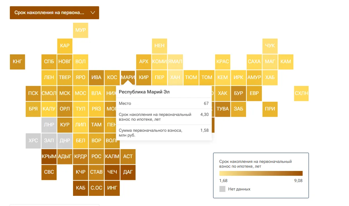 По этому показателю республика занимает 67‑е место среди регионов России — она опережает Алтайский край и отстаёт от Ростовской области. Средний размер первоначального взноса в Марий Эл — 1,58 млн рублей.