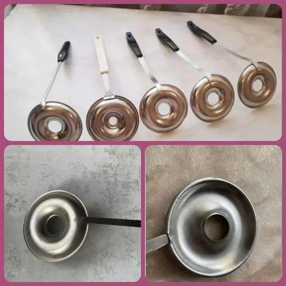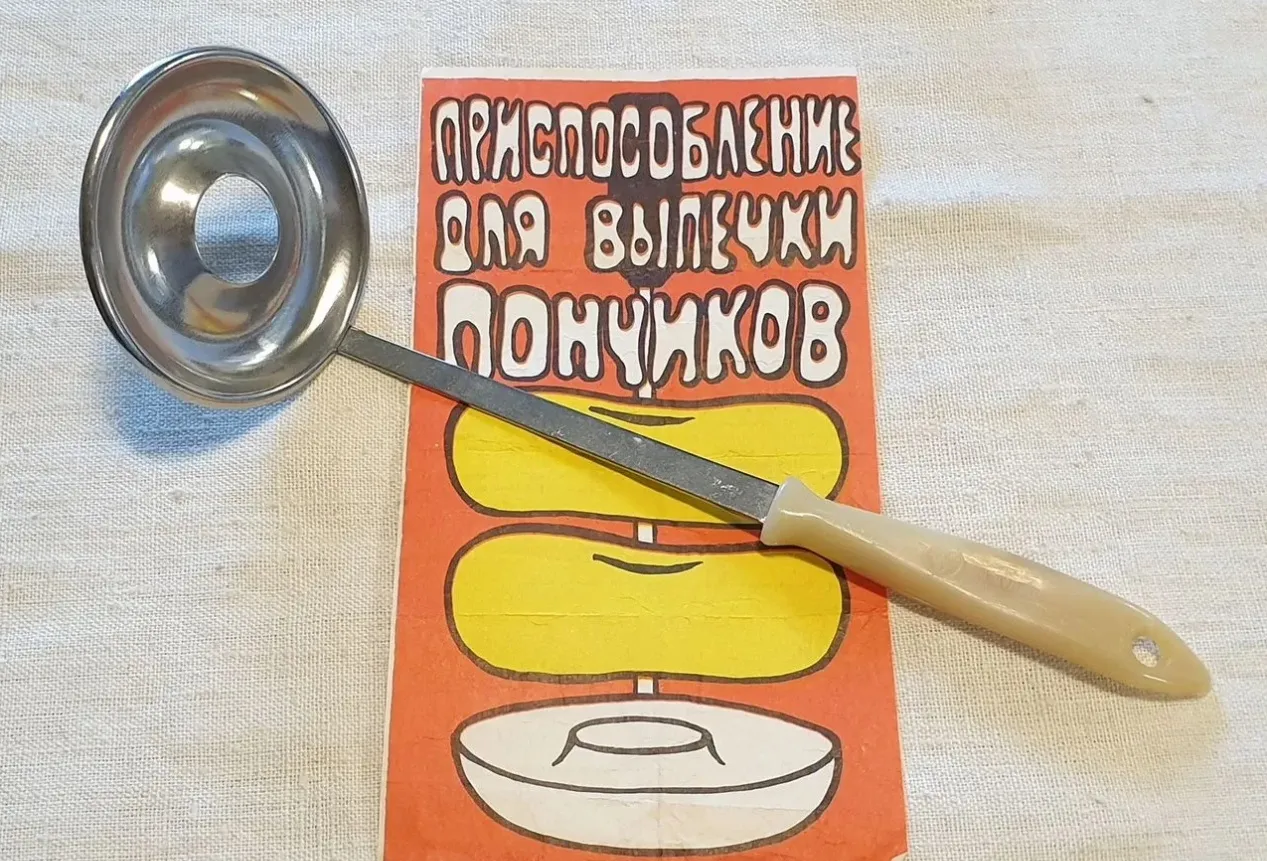 - Зачем дырявые поварёшки? Наверняка знаете.Это форма для выпечки пончиков/пышек: тесто наливают в форму и опускают в кипящее масло (в комплекте даже рецепт теста). (Примечание: автор различает пончики — шарики, и пышки — кольца.)
