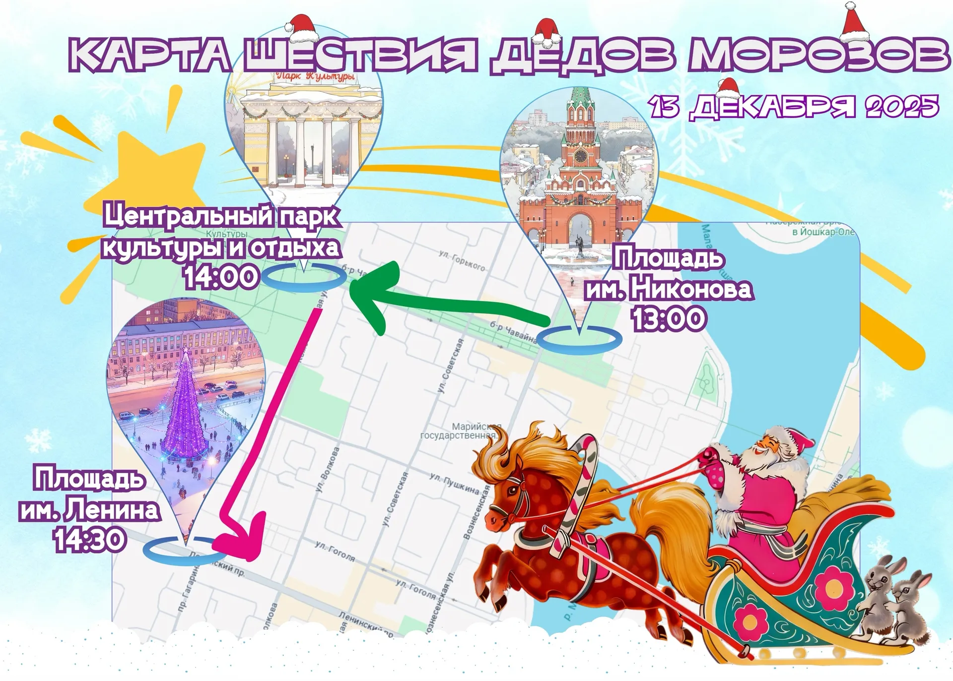 Мэрия Йошкар-Олы приглашает на открытие фестиваля «Марийская зима» и Шествие Дедов Морозов. 13 декабря 2025 года наш город торжественно откроет фестиваль «Марийская зима». Вас ждёт яркая программа, кульминацией которой станет традиционное Шествие Дедов Морозов и зажжение Центральной ёлки.