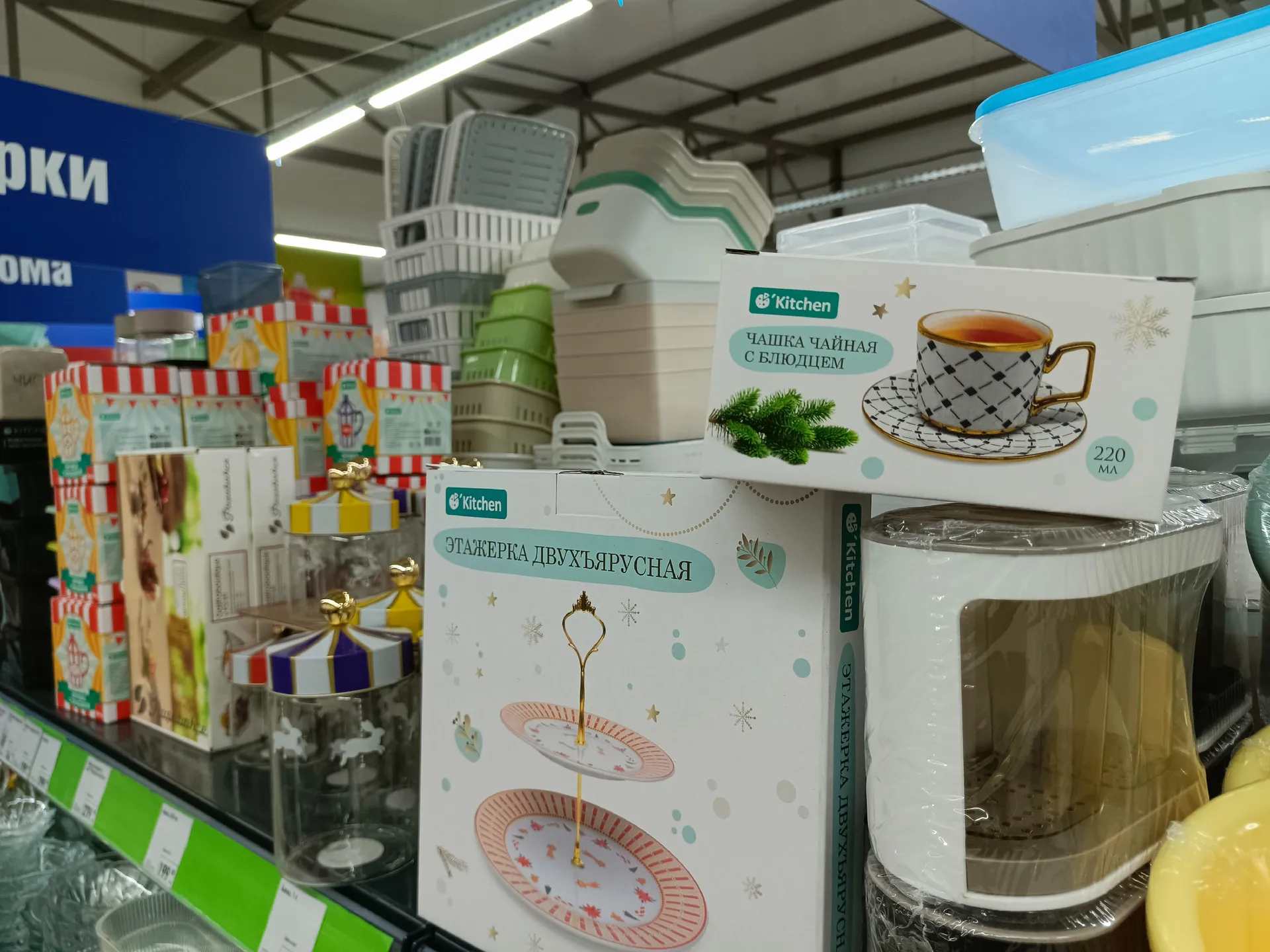 - Посуда для сервировки: чайные и кофейные наборы из фарфора, керамические заварочные чайники, салатники и вазы из стекла, а также разнообразные тарелки и блюда.