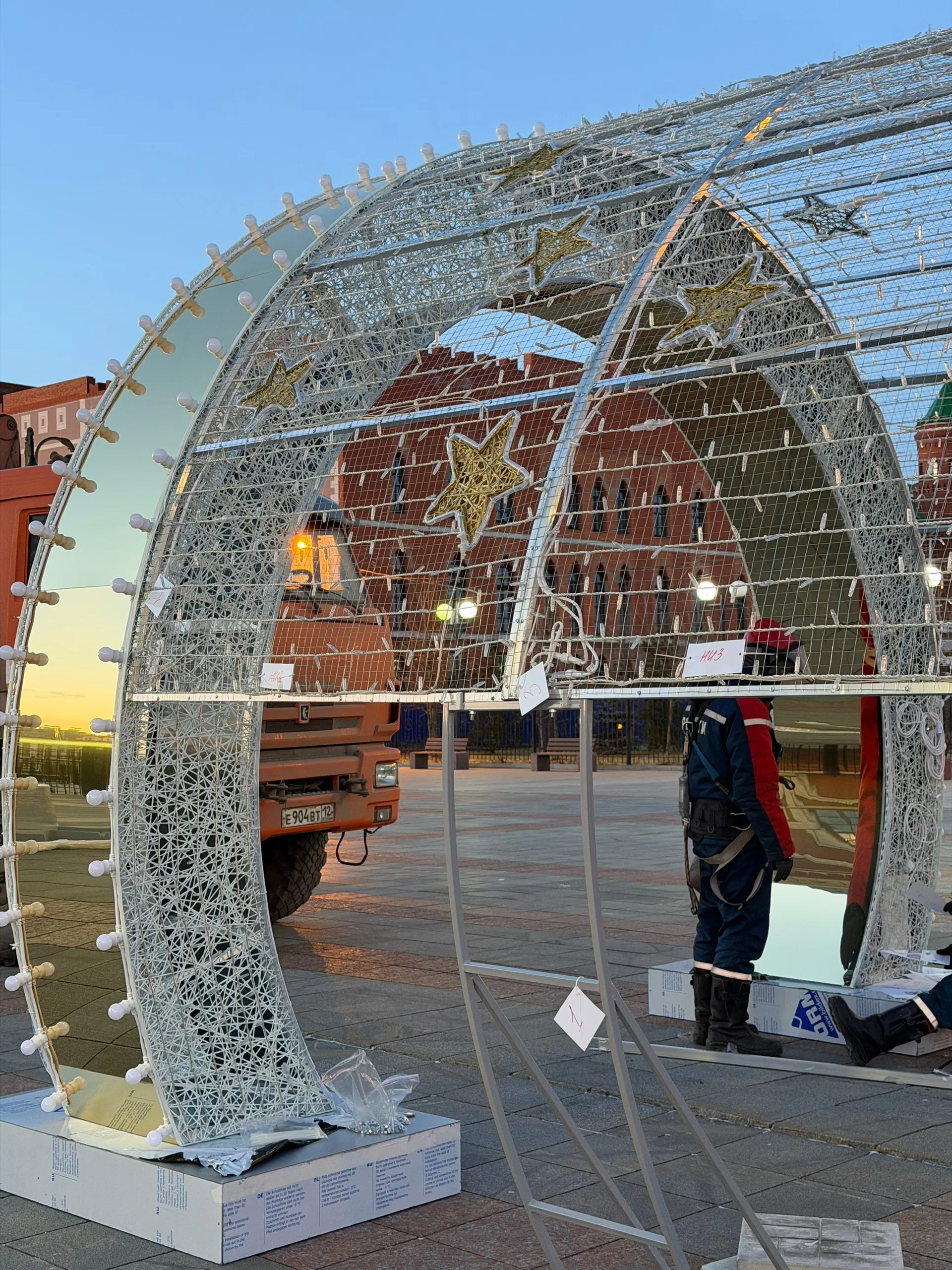 Центр Йошкар-Олы начинает преображаться к праздникам. На площади Пресвятой Девы Марии устанавливают главный новогодний арт-объект этого сезона — световую арку «Звездопад».
