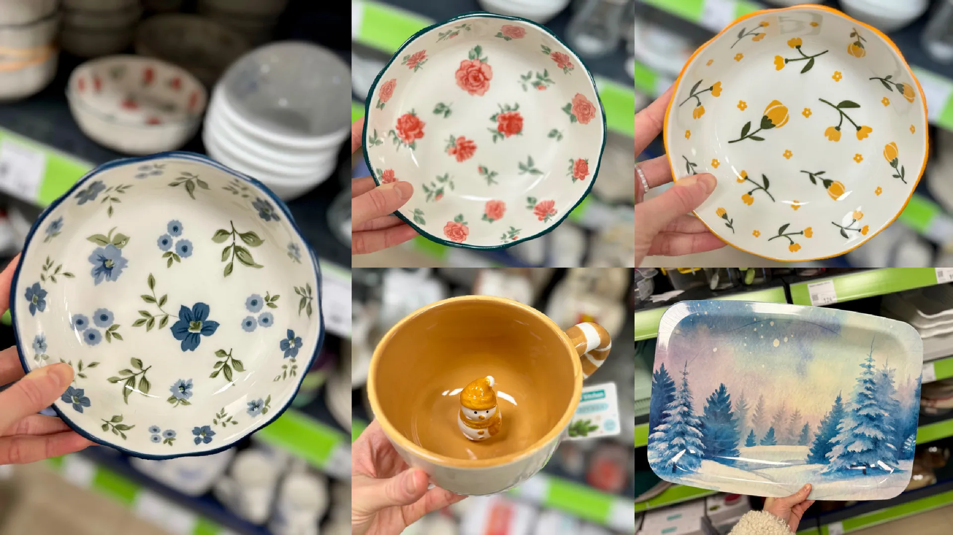 Посуда и кухня: Появились новогодние кружки с бархатистой поверхностью и большие с фигурками внутри (например, со снеговиком). Есть также лаконичные кружки в стиле Pinterest, но, по опыту, они могут недолго прослужить. Обратила внимание на крошечные стеклянные соусницы в нарядных коробочках, крупные стаканы из цветного стекла и очень уютные тарелки с цветочными принтами. Также понравились стильные икорницы с золотой каймой, новогодние конфетницы-ёлочки и баночки с изящными ручками. Для праздника взяла маркеры для бокалов — отличное соотношение цены и качества.