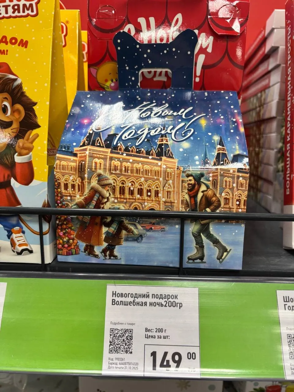 - Начну с сладких подарков. По совету подписчиков я заглянула за ними — и впечатления у меня остались смешанные. Для детских подарков предпочту выбирать конфеты самой или покупать на развес в супермаркете, чем рисковать покупкой сомнительного набора. Возможно, в других городах выбор лучше, у нас в Ростове было всего два варианта.