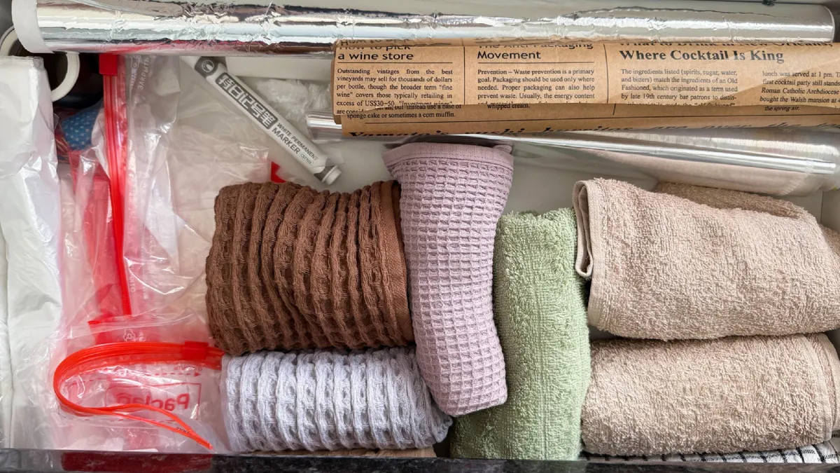 - Сворачивать кухонные полотенца рулонами — как в ресторанах. Удобно хранить в ящике и брать.