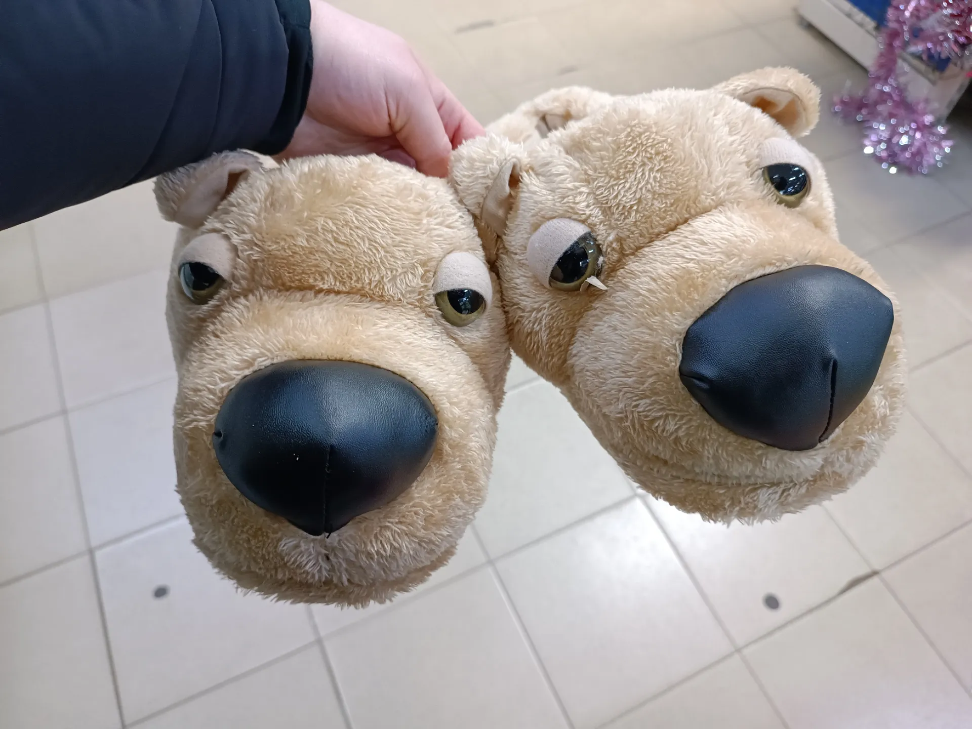 Начну с тапочек. Здесь представлены неожиданно интересные модели. Первый вариант — объемные тапочки с тематикой животных, например, для любителей собак. Стенки у них очень высокие, что создает эффект уюта, но может мешать циркуляции воздуха. Они идеально подходят для кратковременного выхода на балкон или веранду, так как быстро согревают ноги. Подошва имеет противоскользящие точки.
