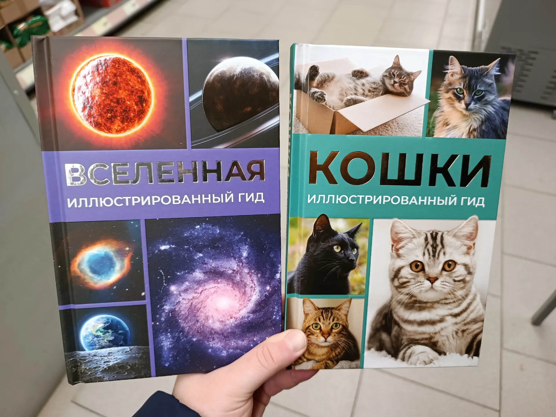 Начну с книг. «Лучшие места России. Иллюстрированный гид» — обожаю такие издания с детства, но у меня их раньше не было: когда стали доступны деньги, уже появился интернет. Зато детям такие книги очень кстати — если у кого есть, обязательно посмотрите. Показываю один случайный разворот: внутри интересно, но немного по объёму. В этой серии есть и другие темы — Вселенная, Кошки, Автомобили. Цена на них указана.