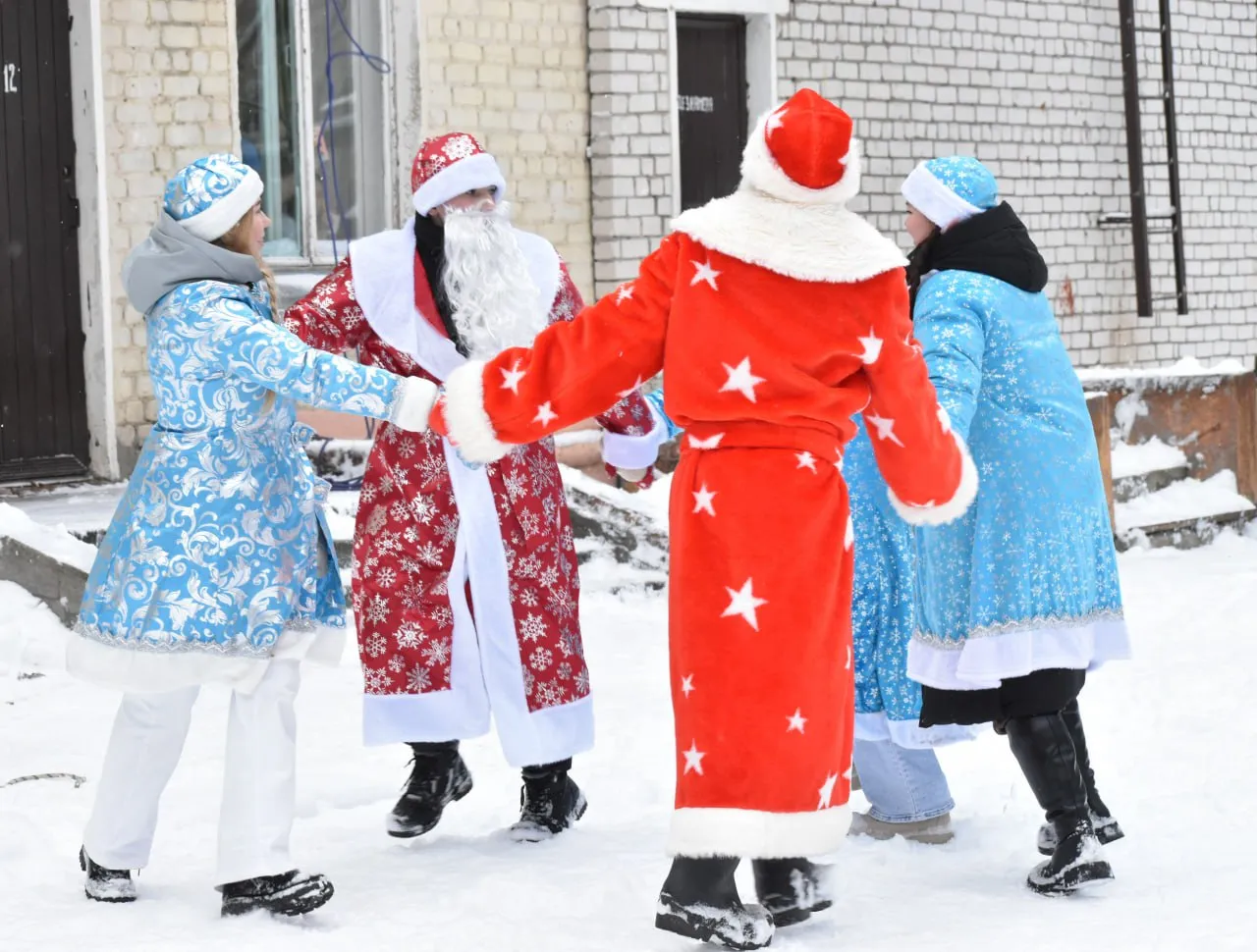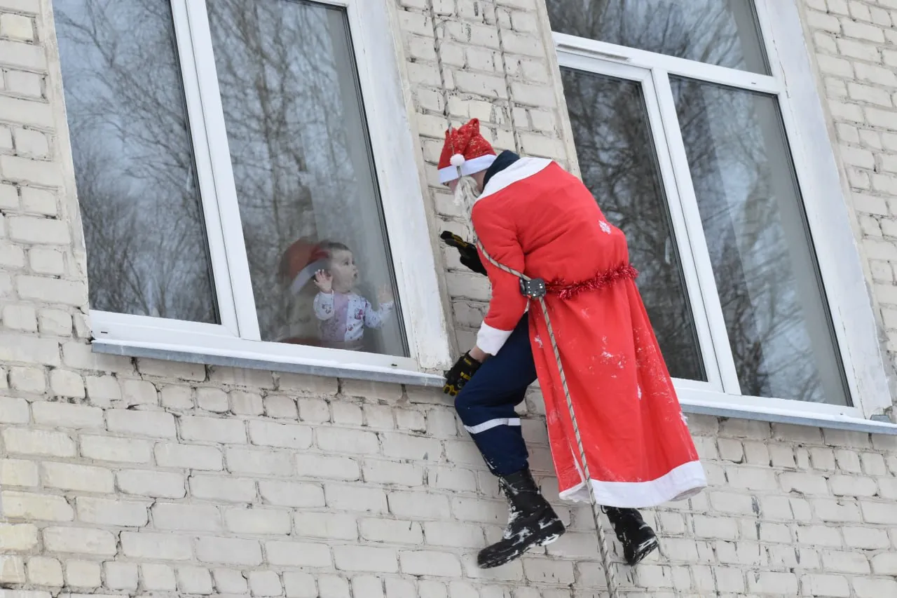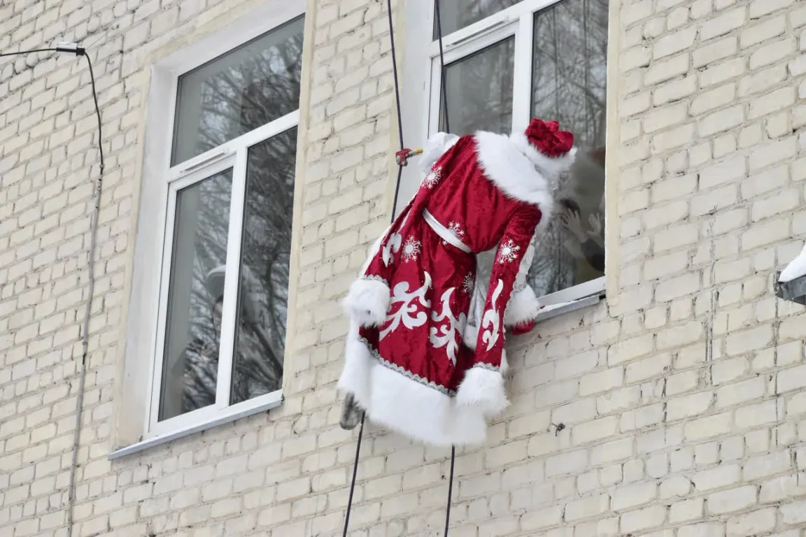 Чтобы поздравить ребят, Деды Морозы и Снегурочки с помощью альпинистского снаряжения спускались прямо с крыхи к больничным окнам. А под окнами развернулось настоящее представление — команда волшебников танцевала и веселилась, даря детям праздничное настроение.