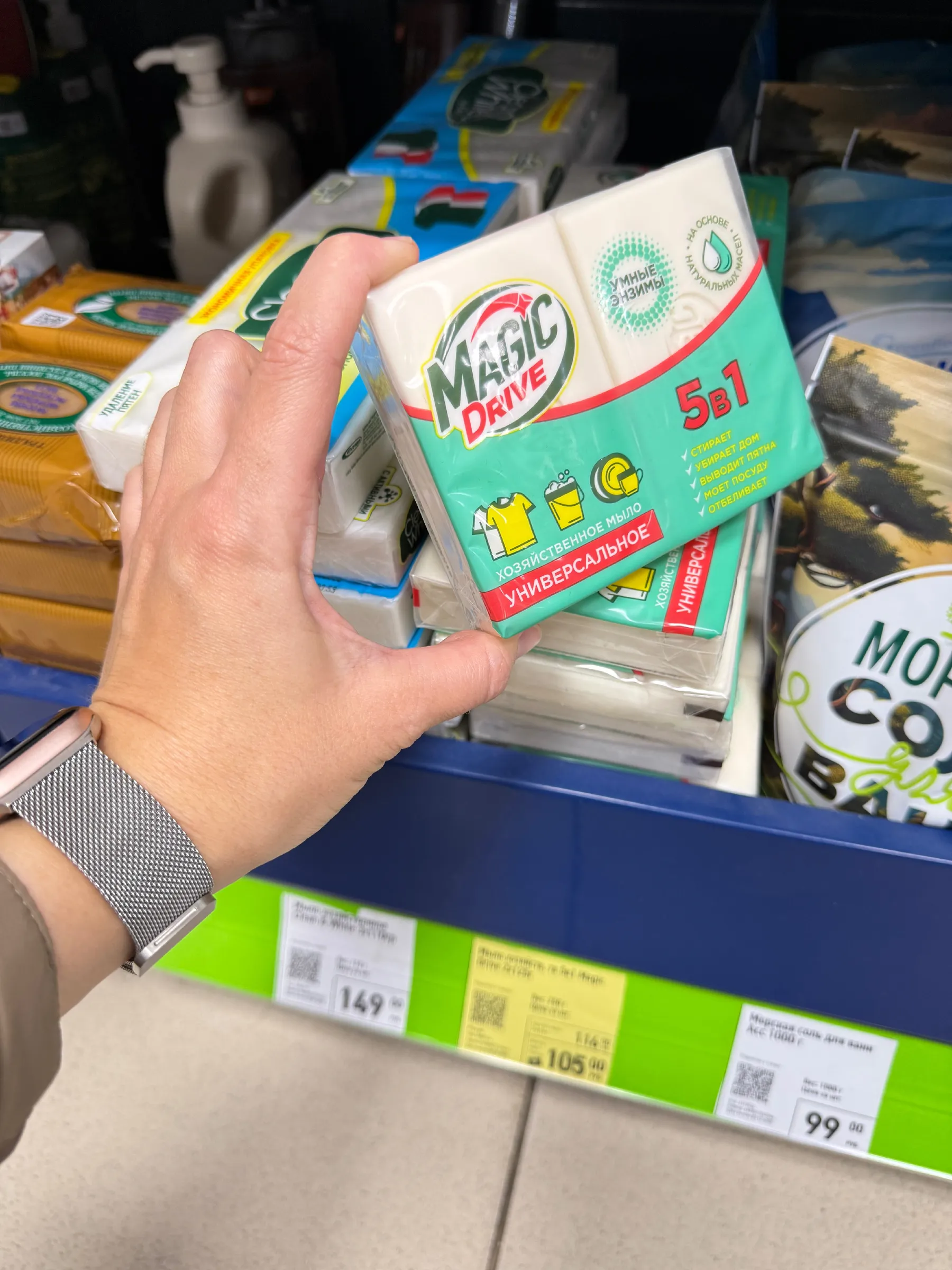 Сегодня мы отправляемся в отдел товаров для дома, где можно найти массу полезных и интересных вещей. Начнём с универсального мыла «5 в 1» — оно идеально для тех, кто предпочитает одно средство для стирки, мытья посуды, уборки и даже для рук. Цена всего 105 рублей при наличии карты магазина.