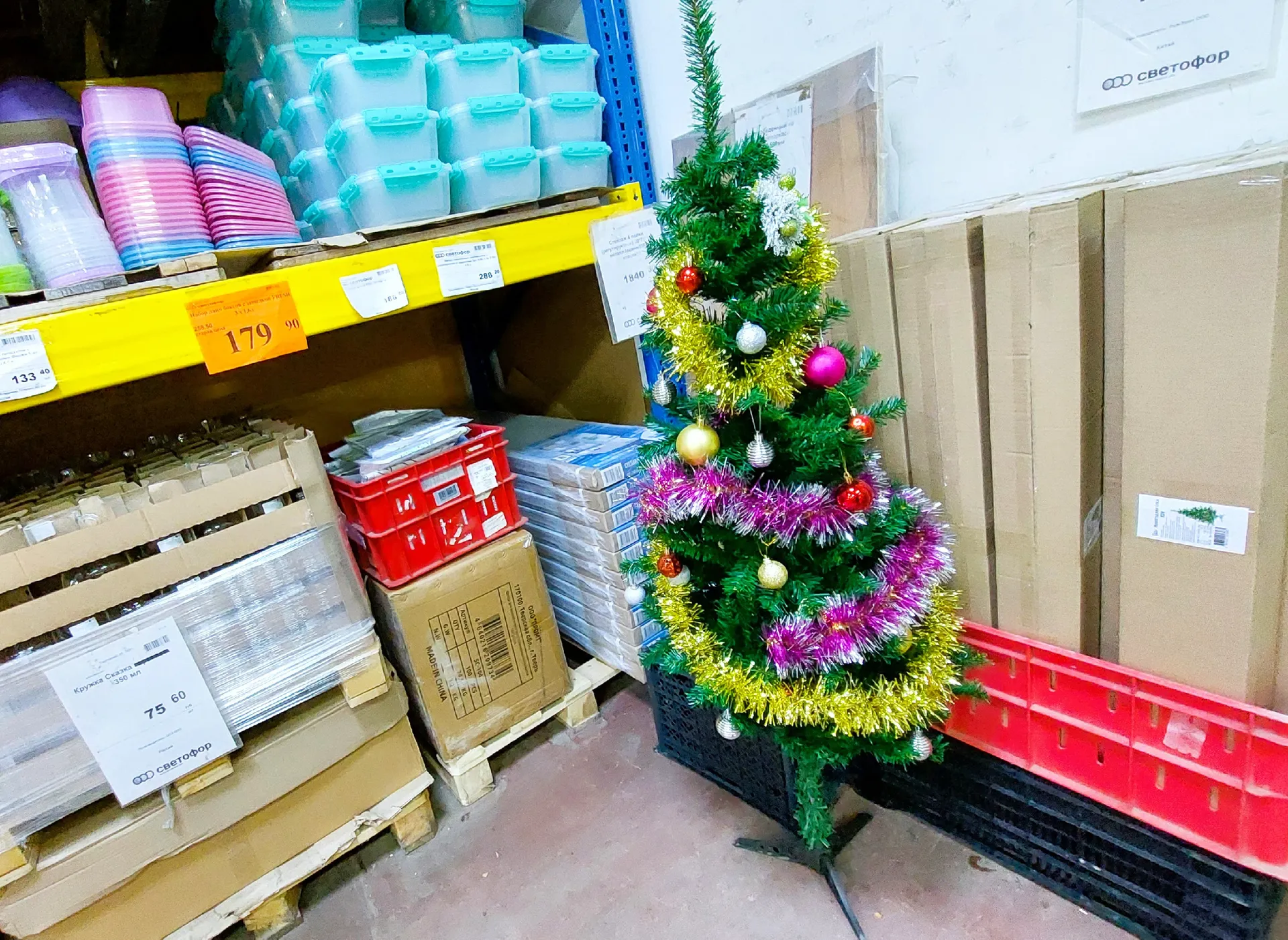 Вчера под вечер заглянула в «Светофор» посмотреть новинки. И каково же было мое удивление, когда меня там уже ждала эта нарядная красавица — искусственная елочка высотой 150 см! Цена очень приятная: 1185,4 рубля за 300 пушистых ярко-зеленых веточек. Она упакована в коробки (стоят справа). Плюсы искусственной елки очевидны: служит много лет (окупается), не осыпается, всегда выглядит идеально, ставить и украшать можно заранее, а хранить — легко и компактно.