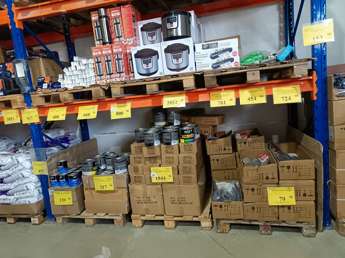 - Посуда и кухонная утварь: большая кастрюля из нержавеющей стали на 5 литров за 846 рублей, стеклянная кружка за 81 рубль и плоская тарелка из опалового стекла за 74 рубля.