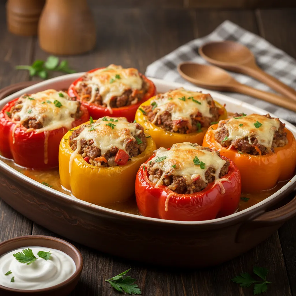 - Фарширование и запекание: Перцы наполняют начинкой, не утрамбовывая, и ставят вертикально в форму. Вливают на дно воду или бульон. Форму накрывают фольгой и запекают при 180°C 45-60 минут.
