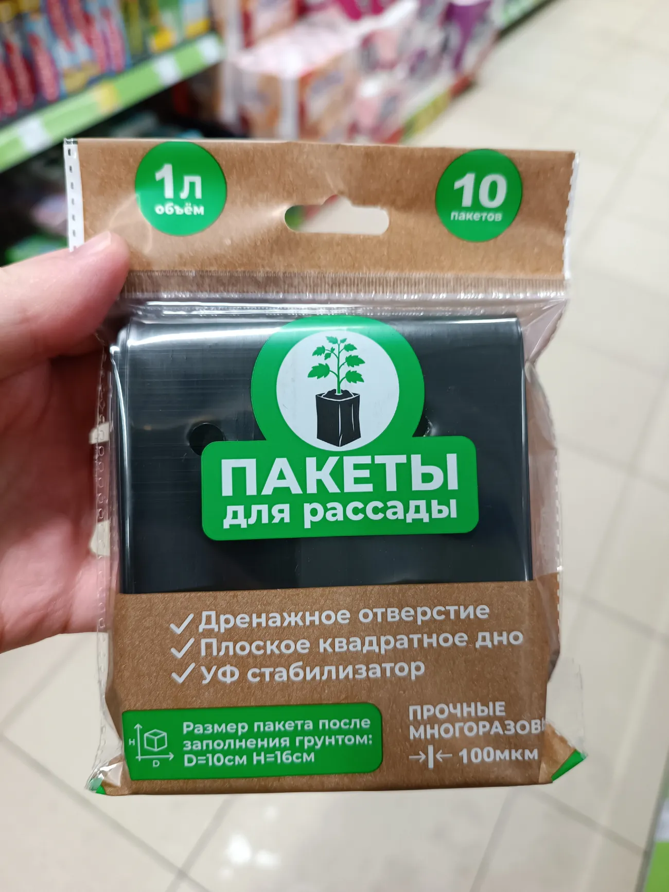 Эксперт начал с товаров для дачников, отметив появление многоразовых пакетов для рассады и подвесных кашпо с закрепленным внутри пакетом.
