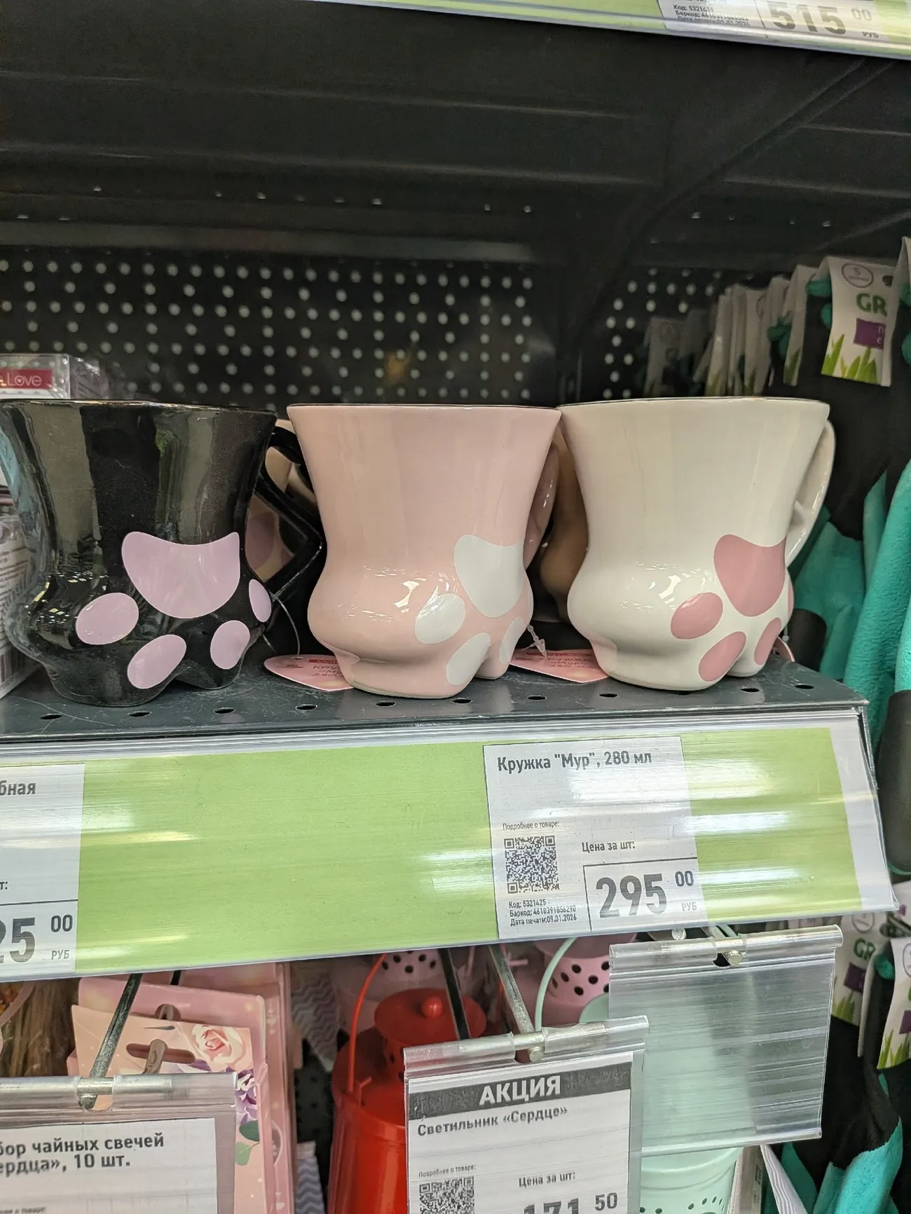 В магазинах уже вовсю готовятся к Дню всех влюблённых. Целый стенд заставлен тематическими товарами: от небольших подарков до украшений для дома. Среди множества мелочей нашлись и настоящие находки. Например, необычная кружка в виде лапки, которая удивила своим лёгким весом, или изящные вазы в форме сердца по цене 225 рублей. Особенно покорили стеклянные банки красивого оттенка — их дизайн заслуживает высшей оценки, даже если практическое применение ещё не очевидно.