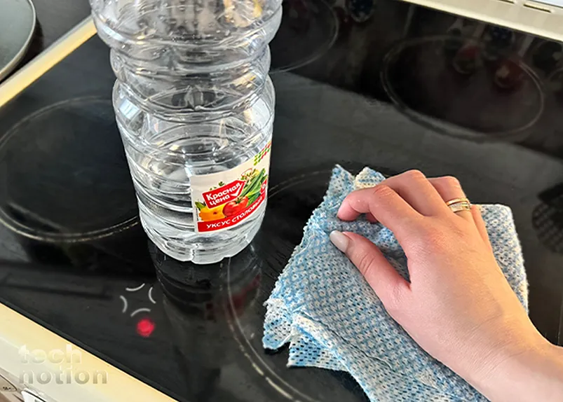 - Чистка стеклокерамической плиты: Чтобы убрать цветные разводы, протрите поверхность тряпкой, смоченной в равных частях воды и столового уксуса.