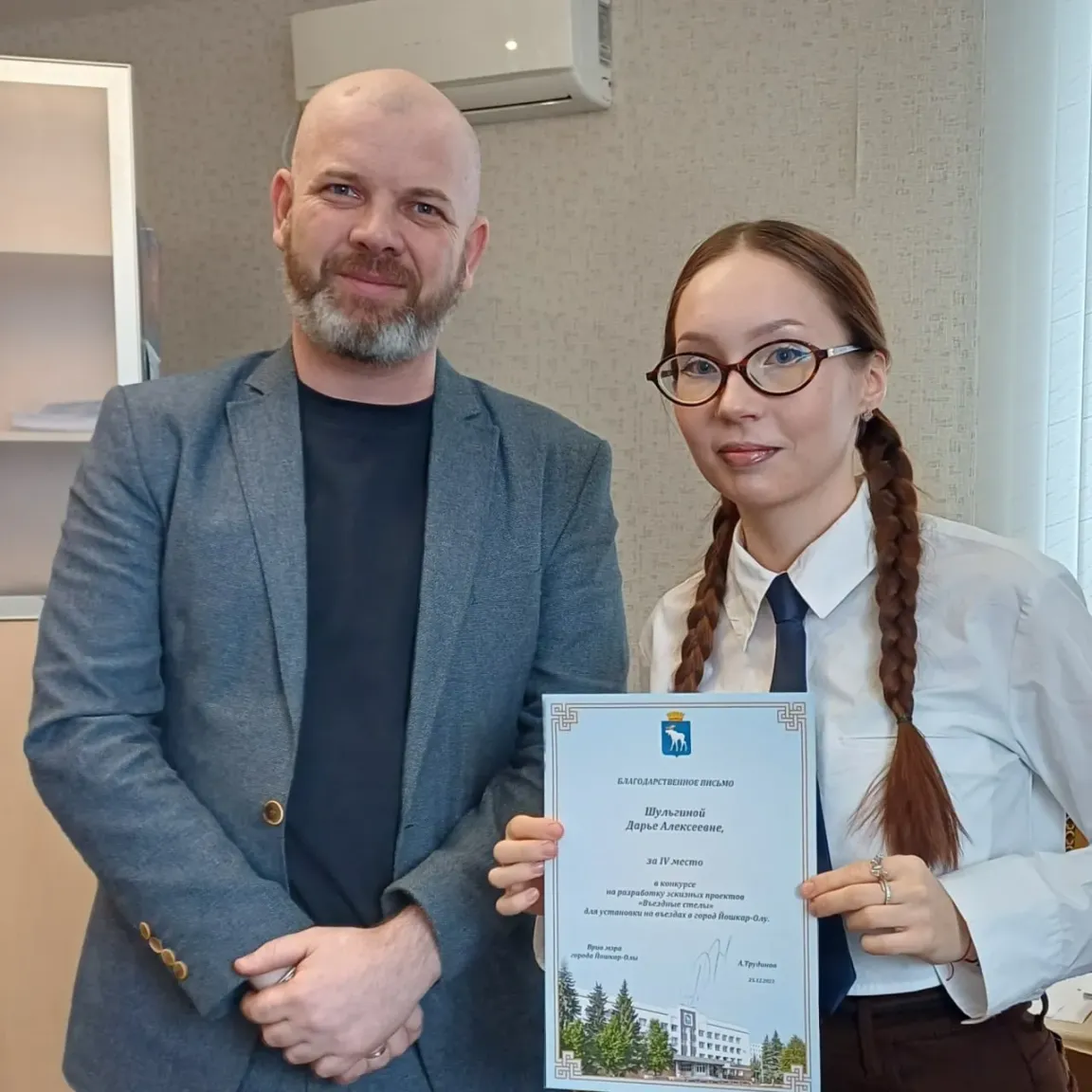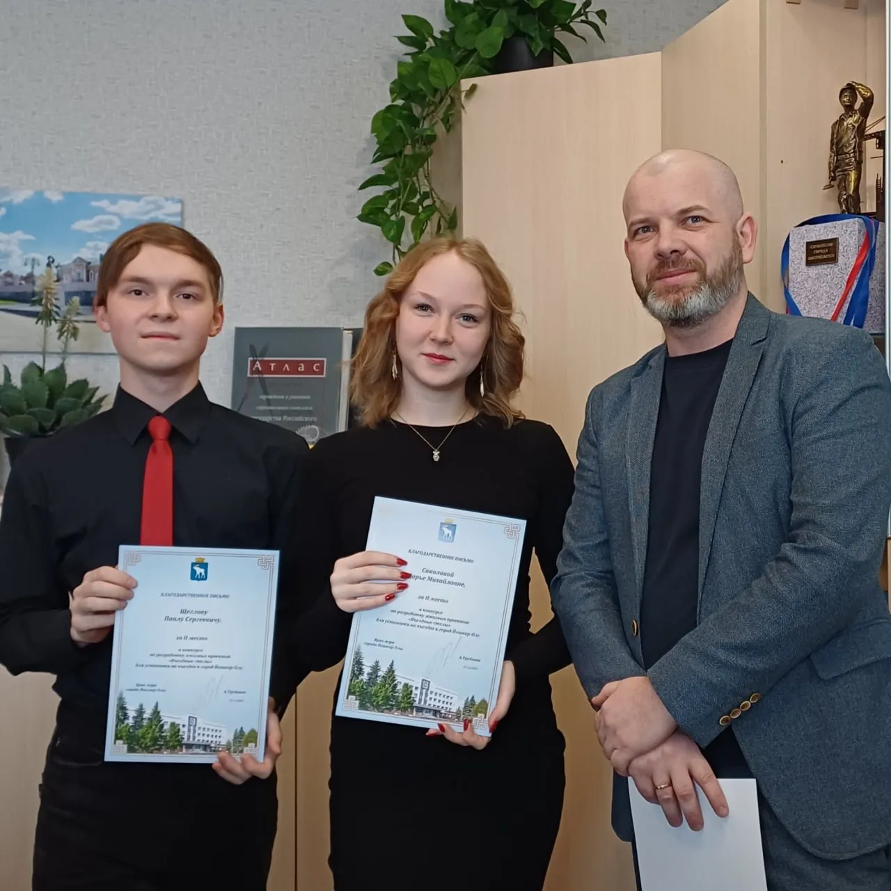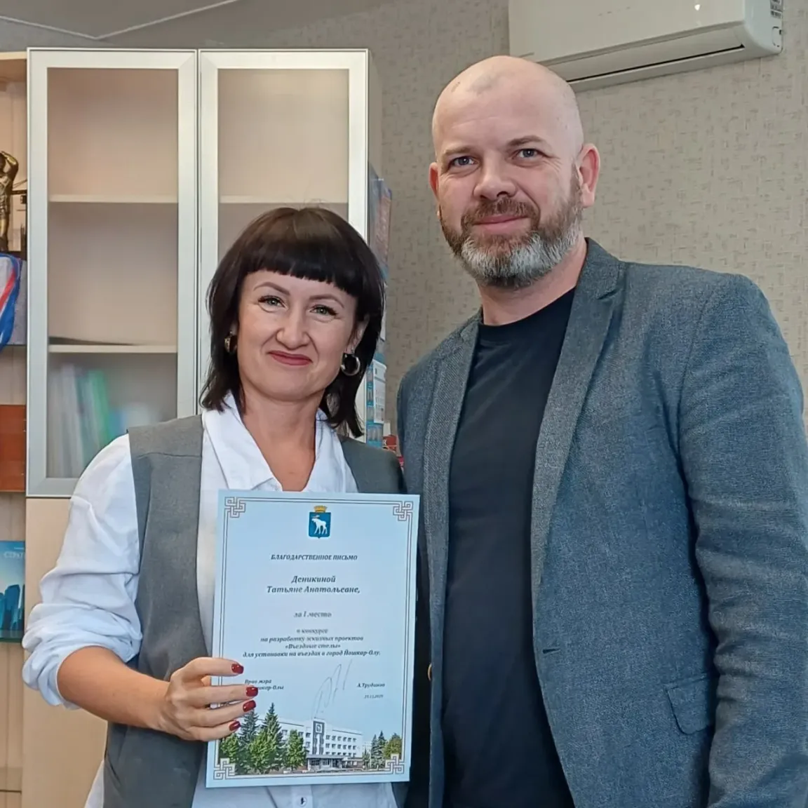 В администрации Йошкар-Олы состоялась церемония награждения победителей конкурса на разработку эскизов новых въездных стел. Благодарственные письма от имени врио мэра Антона Трудинова вручил его заместитель по строительству Алексей Поляков.