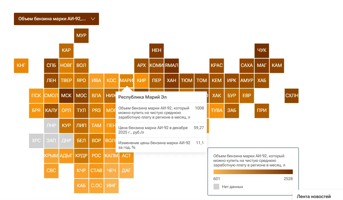 Специалисты Центра экономических исследований «РИА Рейтинг» составили рейтинг российских регионов по объёму бензина АИ-92, который можно приобрести на одну среднемесячную чистую зарплату. Исследование основано на данных официальной статистики за декабрь 2025 года.