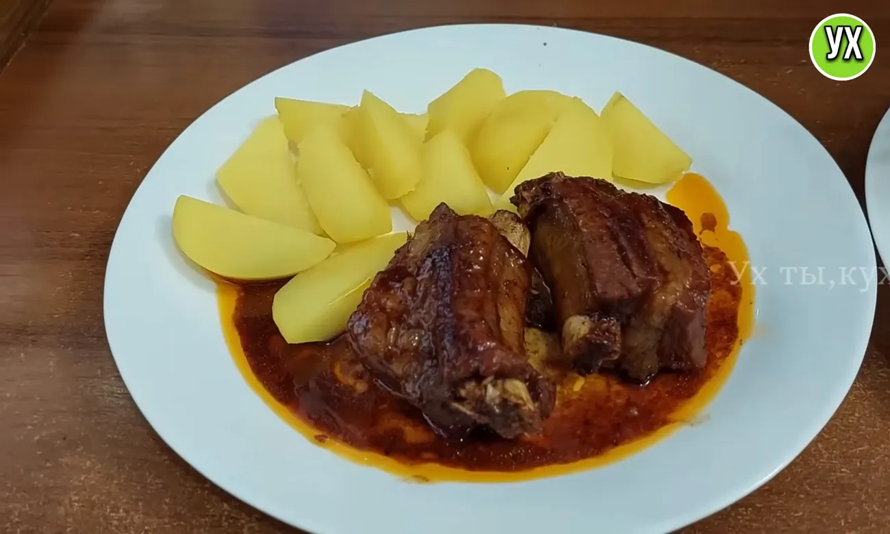 После закипания блюдо тушится под крышкой на медленном огне около часа. За это время мясо становится мягким, а соус — густым и насыщенным. Подавать его можно с картофелем, хлебом или солёными огурцами.